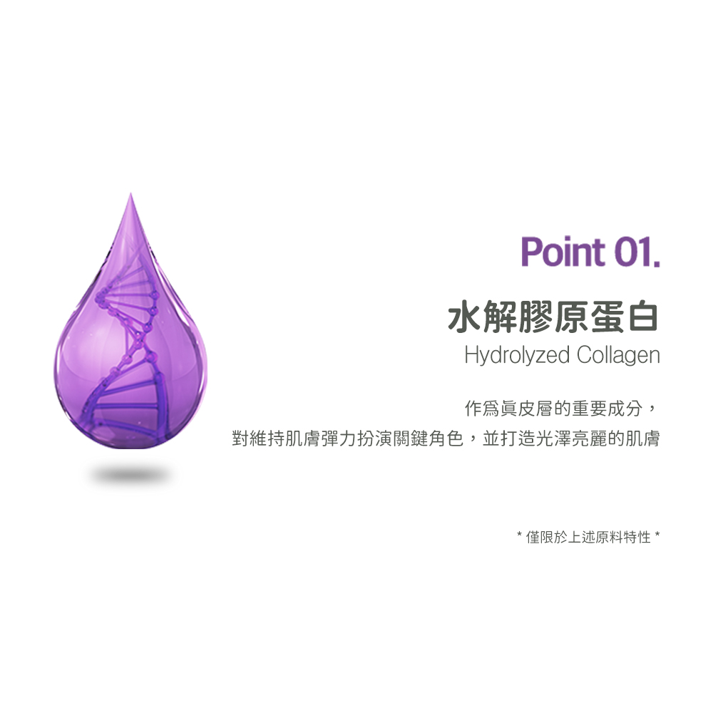 含有水解膠原蛋白,有助於維持皮膚彈性,使皮膚有光澤。